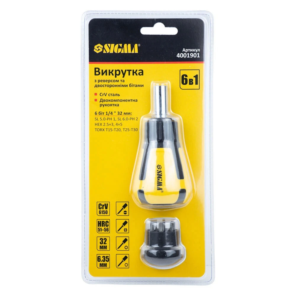 Викрутка з реверсом і двосторонніми бітами 6в1 CrV SIGMA (4001901) - для монтажу і демонтажу різьбових з'єднань.