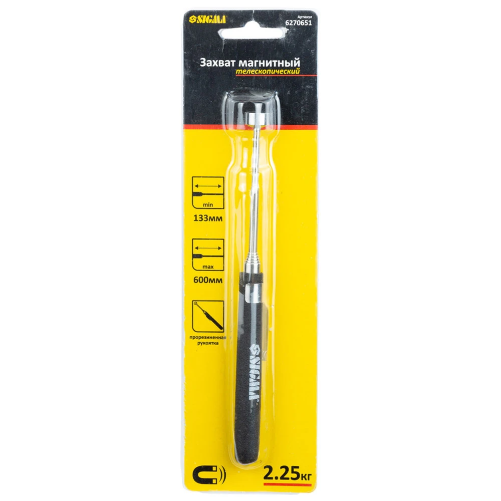 Захват магнітний телескопічний 133-600мм SIGMA (6270651) призначений для захоплення деталей і елементів кріплення при необхідності витягти їх з важкодоступних місць. Максимальне навантаження на магніт, яка становить 2,25кг, допускається тільки у вертикальному положенні рукоятки. Завдяки телескопічної конструкції існує можливість регулювати довжину захоплення.