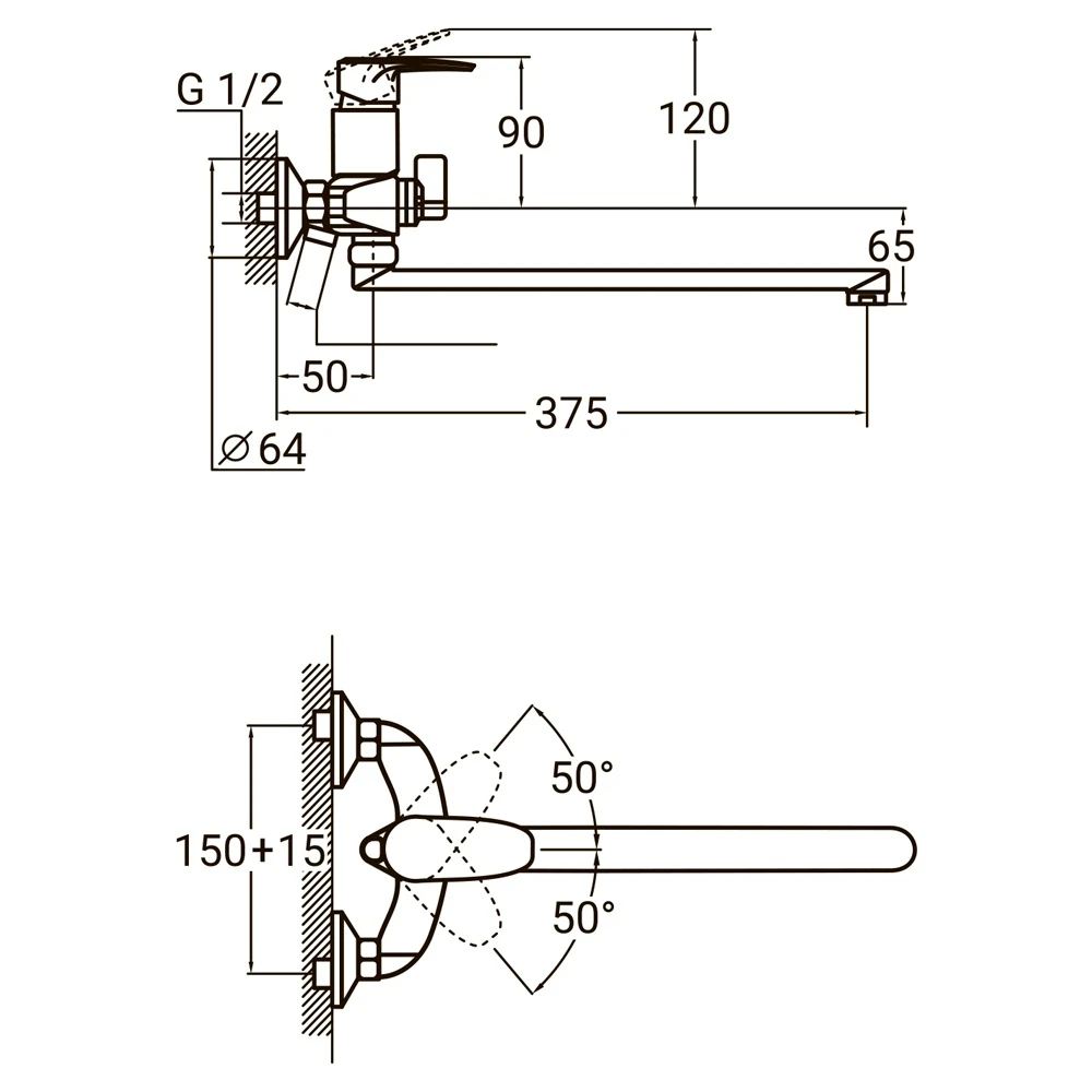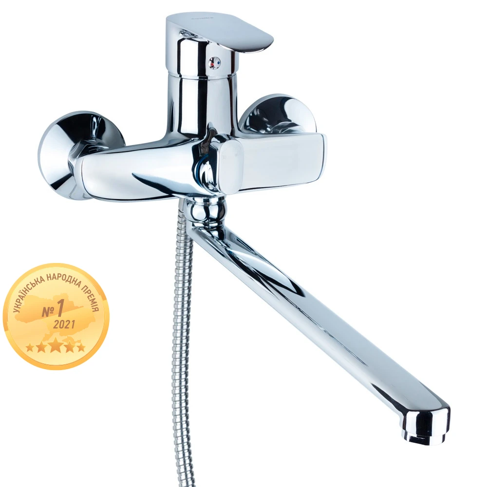 Він має класичну форму з дизайнерським акцентом, тому підійде для різних типів домашніх ванних кімнат, готельних номерів та інших побутових приміщень. Завдяки довгому поворотному виливу, змішувач для ванни Акватика дозволяє зручно помити руки і предмети побуту.