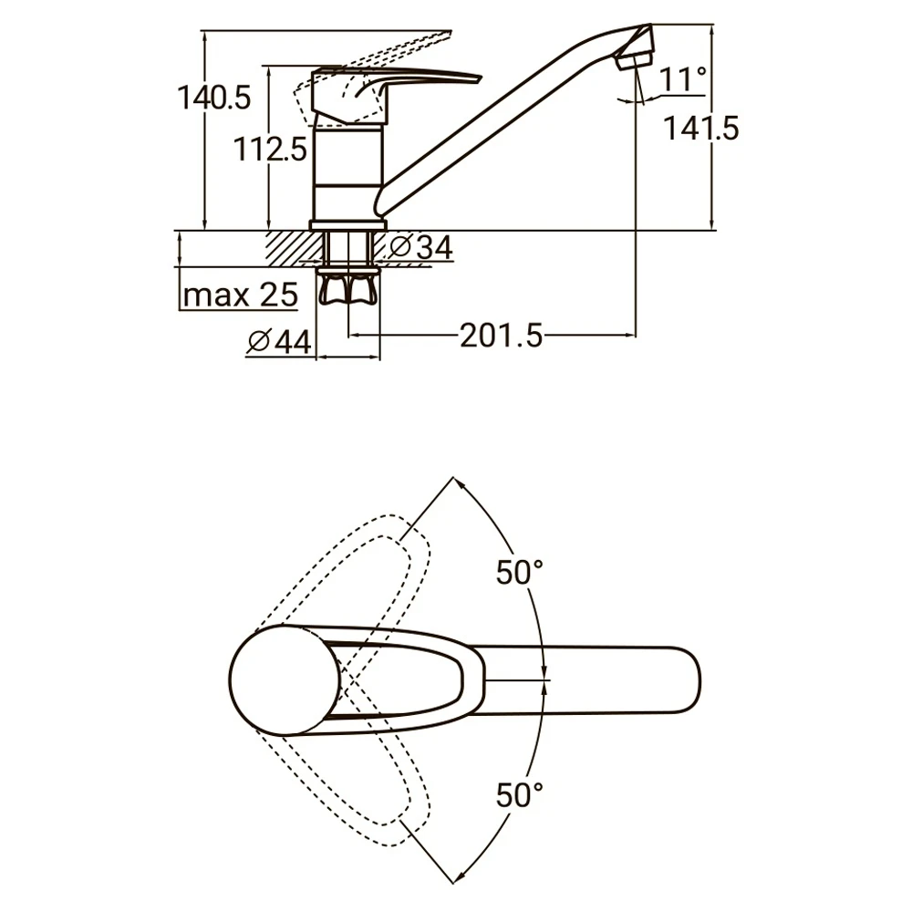Кріплення на мийку здійснюється за допомогою гайки-корони. Для підключення до водопроводу передбачений гнучкий підвід.