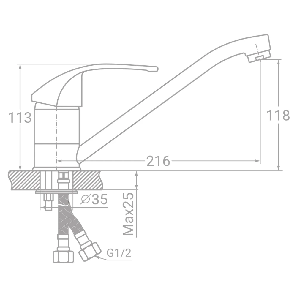 Вид установки даного змішувача на мийку - виразний, з кріпленням на шпильці і підключенням до магістралі за допомогою гнучких підведень.