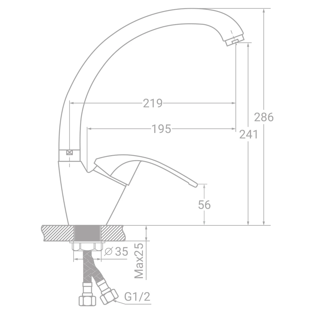 Монтаж на поверхню виробляється врізним способом, зі зворотного боку фіксується спеціальною гайкою. Для підключення до магістралі в комплекті поставляються 2 гнучких підведення.