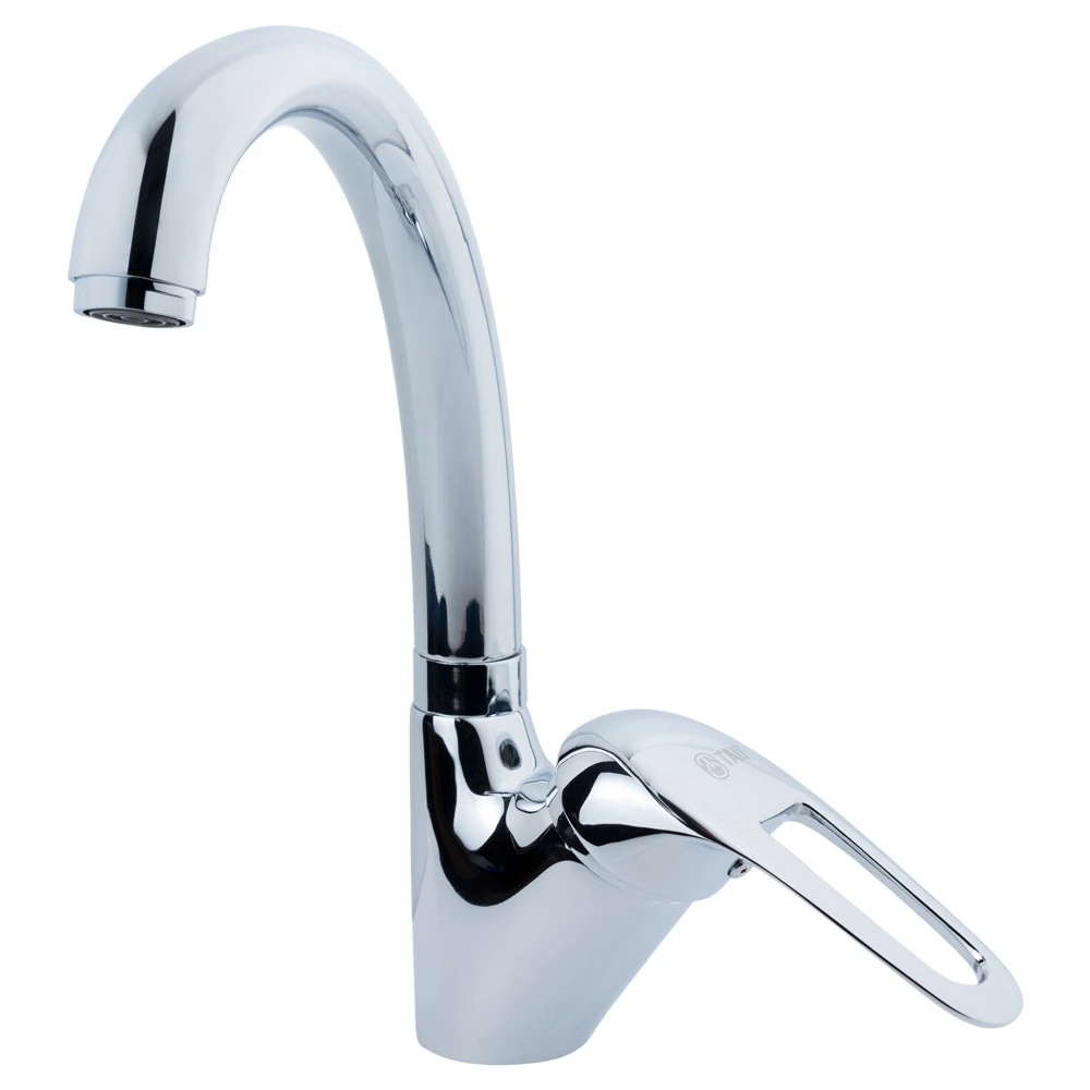 Змішувач для кухні ТАУ SF-4B439C - це класична модель з J-подібним поворотним виливом з вбудованим аератором. Важіль конструктивно має овальну форму з отвором посередині. Для плавного регулювання температури і потужності струменя встановлений картридж з кераміки, діаметр 40 мм.