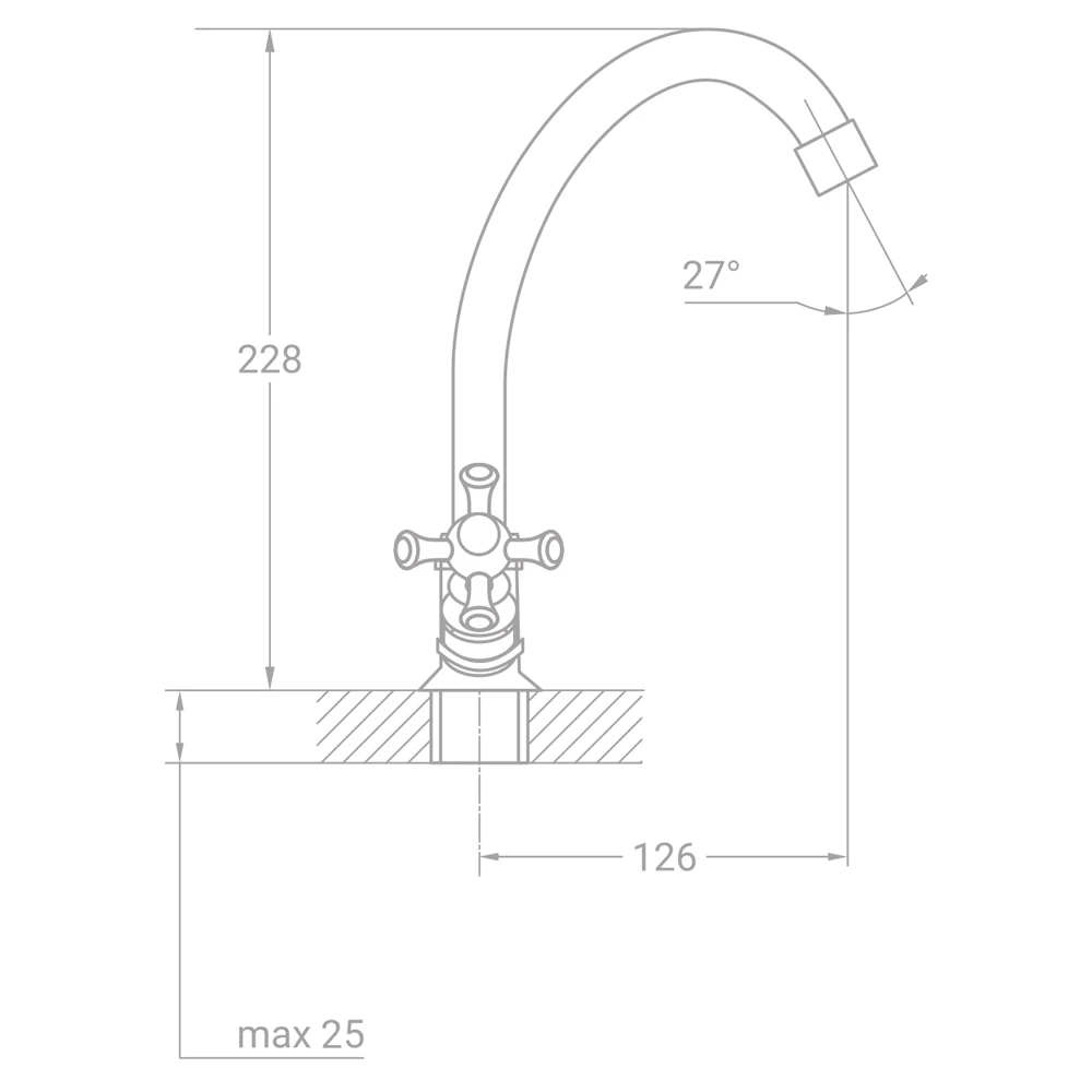 Модель VN-1B160C - це двухвентильний змішувач для кухні з вигнутим виливом висотою 23 см і вбудованим аератором. Виріб виконаний в класичному стилі, вентилі прикрашені кольоровими заглушками. Завдяки хромонікелевому покриттю кран захищений від корозії, а також дрібних механічних пошкоджень.