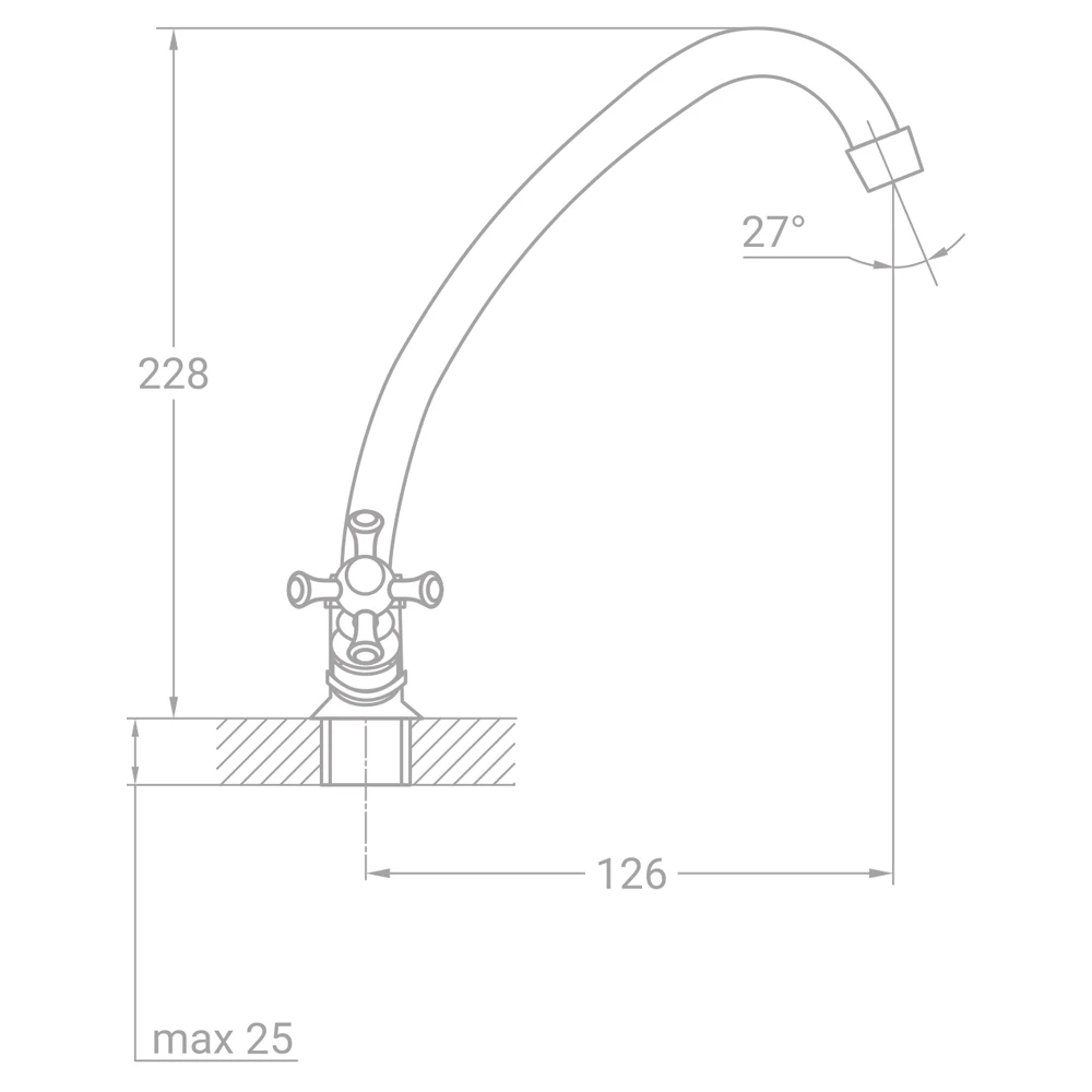 Змішувач для кухні з хромонікелевим покриттям VN-2B160C - модель економ-класу для любителів ретро-стилю. Його характеризує вигнутий поворотний вилив, двохвентельне управління напором і температурою води, доступна вартість.