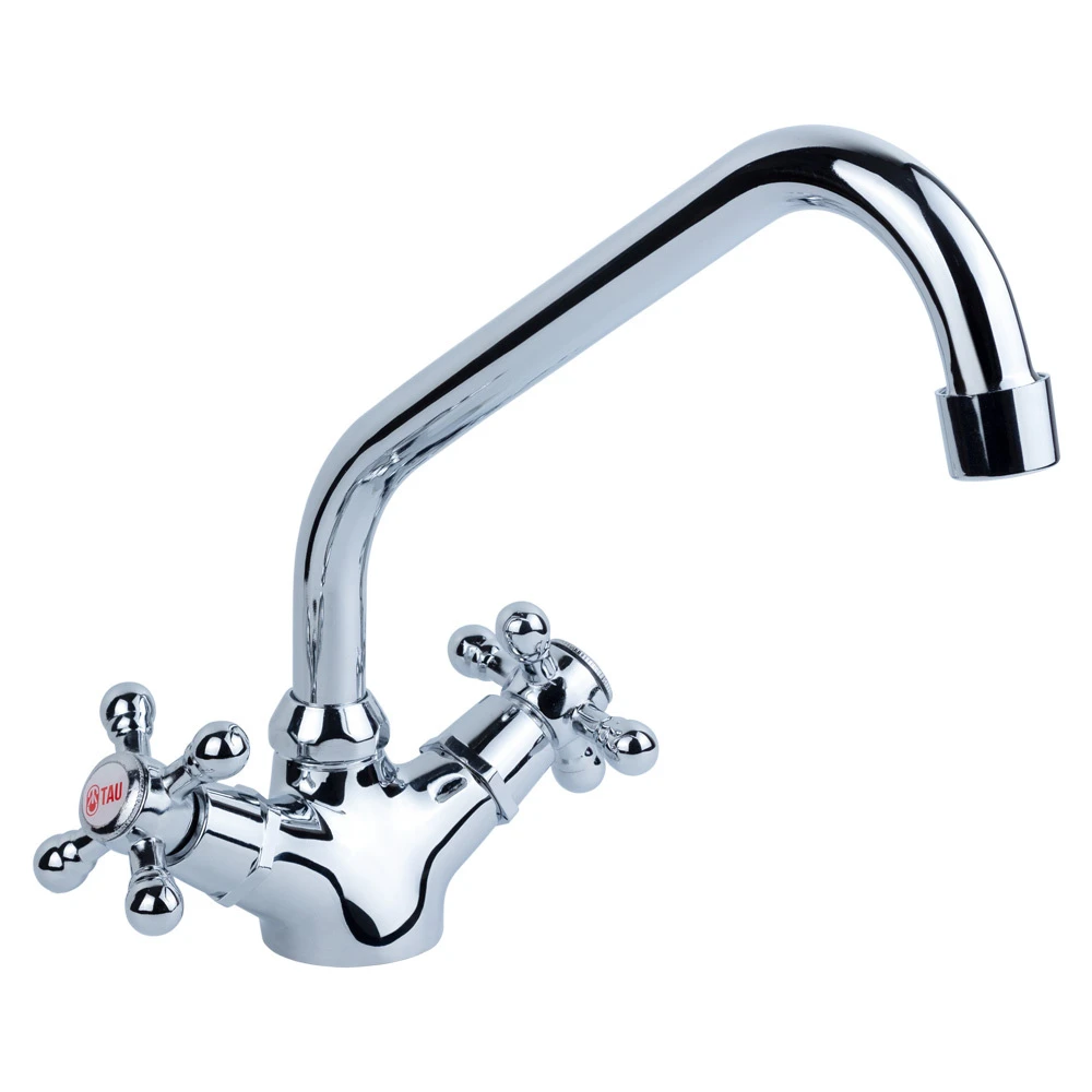 VD-4B161C - це змішувач для кухні з поворотним зігнутим гусаком (винос 20 см) і двома вентилями хрестоподібної форми з заглушками, на які нанесені червоний і синій логотип TAU для позначення гарячої та холодної води.