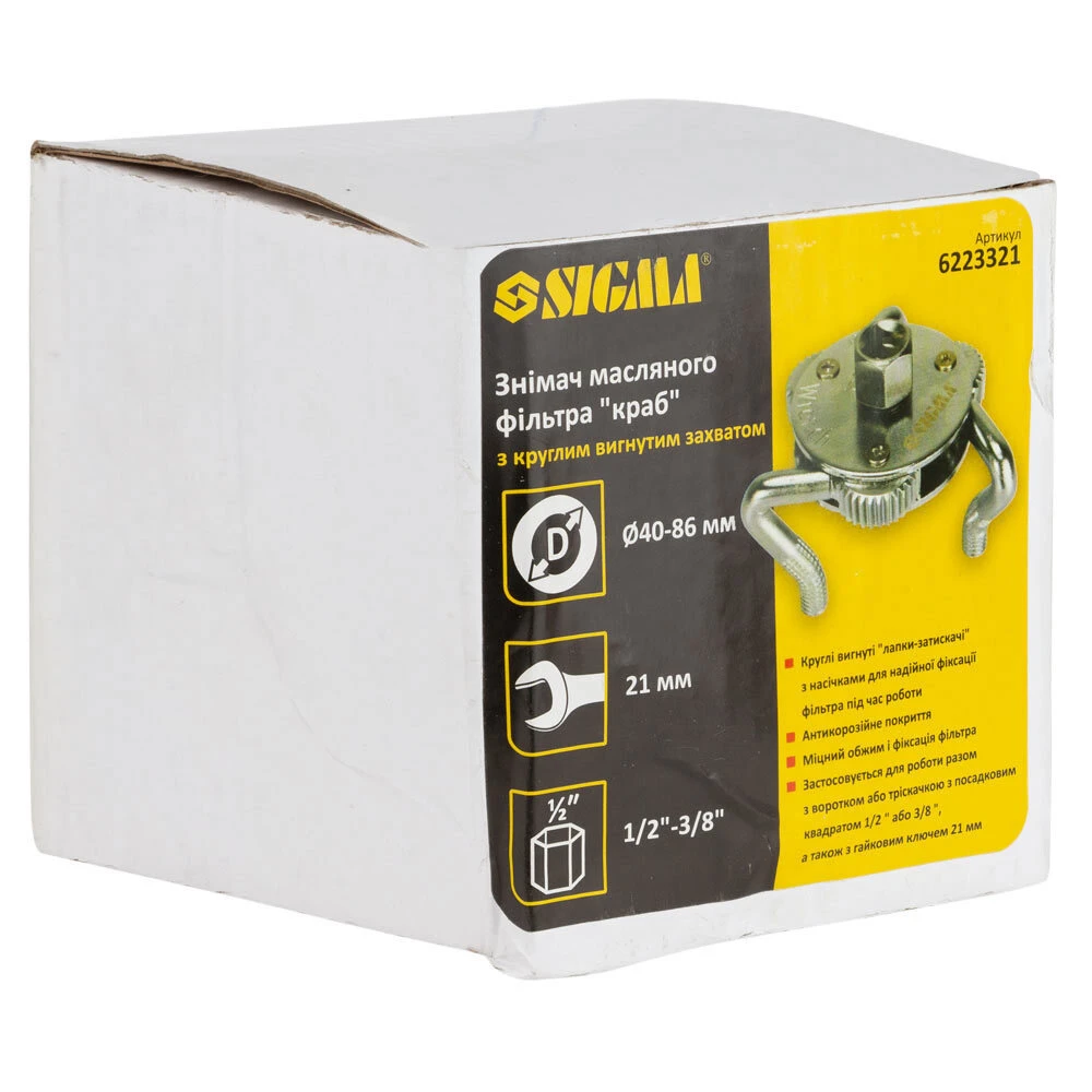 Знімач масляного фільтра "краб" Ø40-86мм з круглим вигнутим захватом та адаптером 1/2"-3/8" SIGMA (6223321) призначений для демонтажу і монтажу масляних фільтрів автомобілів. Основною перевагою даного знімача є його універсальність. За його допомогою можна знімати масляні фільтри різного діаметру.