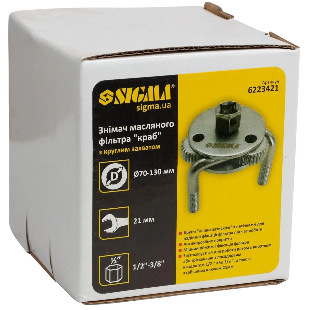 Знімач масляного фільтра "краб" Ø70-130мм з круглим захопленням і перехідником 1/2"-3/8" SIGMA (6223421) призначений для демонтажу і монтажу масляних фільтрів автомобілів. Основною перевагою даного знімача є його універсальність. За його допомогою можна знімати масляні фільтри різного діаметру.